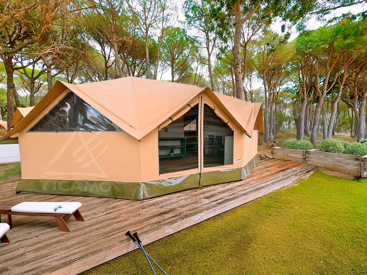 Colocada sobre una tarima de madera, está equipada con mobiliario sostenible, una nevera de diseño y todo aquello que necesitas para una estancia inmejorable en grupo o en familia. Dispone de ventiladores o calefactores bajo demanda, según la época del año.